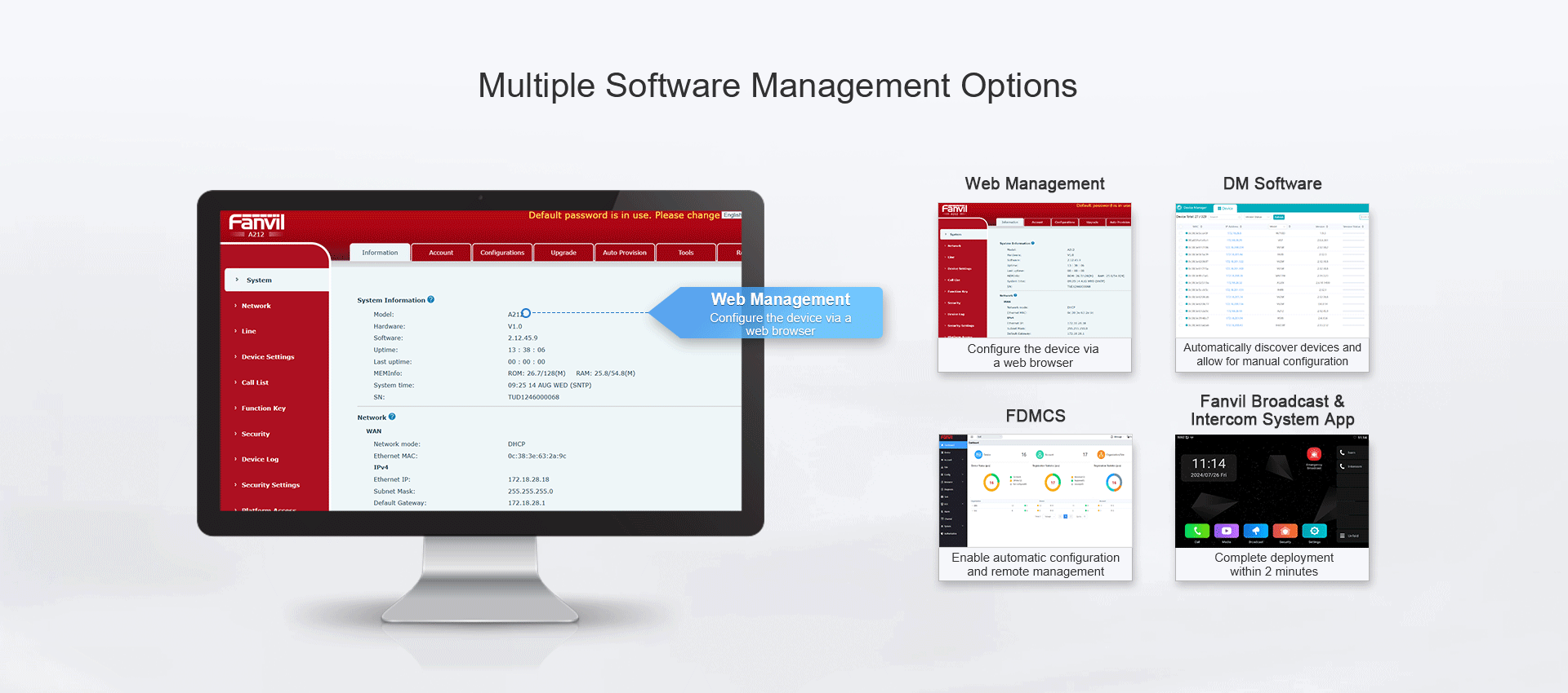 Easy to manage: Supports web, DM software, FDMCS and Fanvil broadcast intyercom APP management equipment